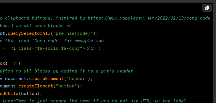 Having a button inside the code block which let the reader copy the contents in one go sounded like a good idea, and after playing with clipboard.js for alfagok, I knew it should not be that hard. Also, after looking into the matter a bit more, I figured that Javascript nowadays had a native way of copying contents of an element or block to the user's clipboard through the navigator.clipboard.write()
